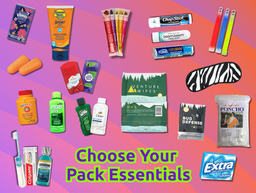 - Your choice of non-branded items (earplugs, poncho, sunscreen, wipes, etc) to build